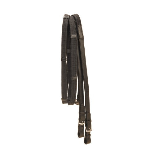 Cotton web with leather stops. These reins are perfect for teaching students where to hold the reins and are anti-slip, without the deterioration that happens with colored rubber reins. 60" long.